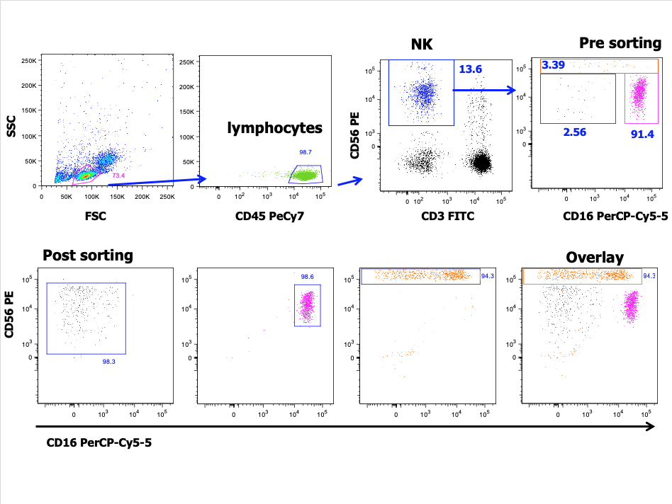 Through these instruments, a variety of fluorochromes attached to different antibodies can screen the molecular components of a cell first to characterize it (flow cytometer) and then to specifically select it for isolation (cell sorter).